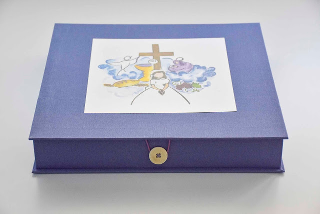 Caja realizada a medida para guardar el álbum de fotos de la Primera Comunión. La caja está totalmente forrada con tela de encuadernar violeta y en la cubierta una reproducción de la acuarela realizada por Celia Luz, mamá de Leire. El interior de la caja está forrada con papel de empapelar de Coordonne. La caja se cierra con botón suitbook y goma elástica.